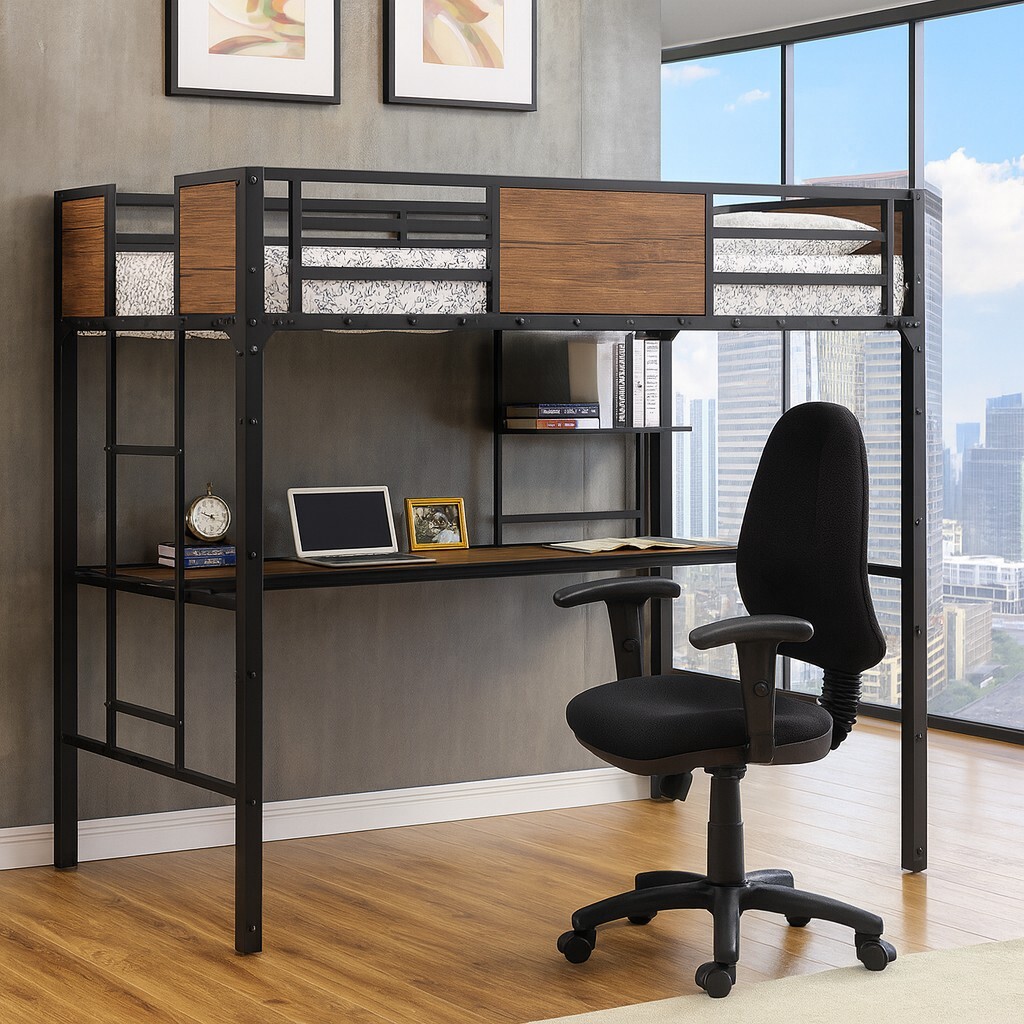 Adults often use loft beds to separate rest from activity in small rooms. The space below can hold a futon, reading chair, or compact sofa. This setup helps adults create a small living nook in a tight space.